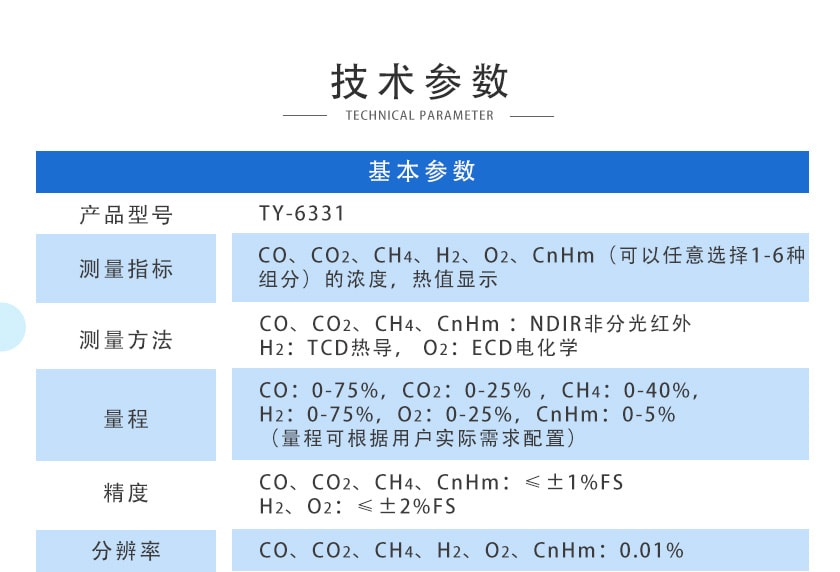 CO:0-75%,CO2:0-25% ,CH4:0-40%,H2:0-75%,O2:0-25%,CnHm:0-5%(量程可根據用戶實際需求配置)
